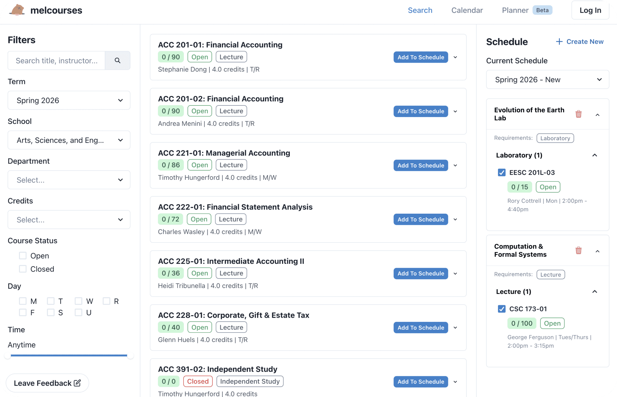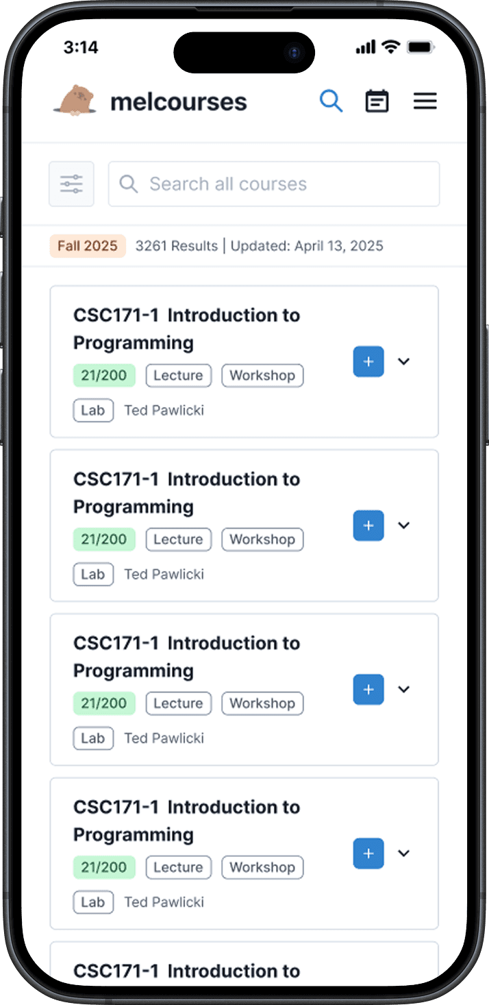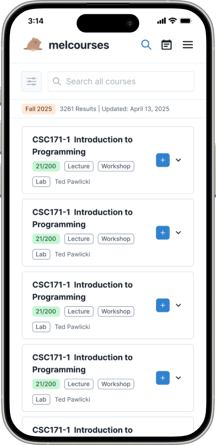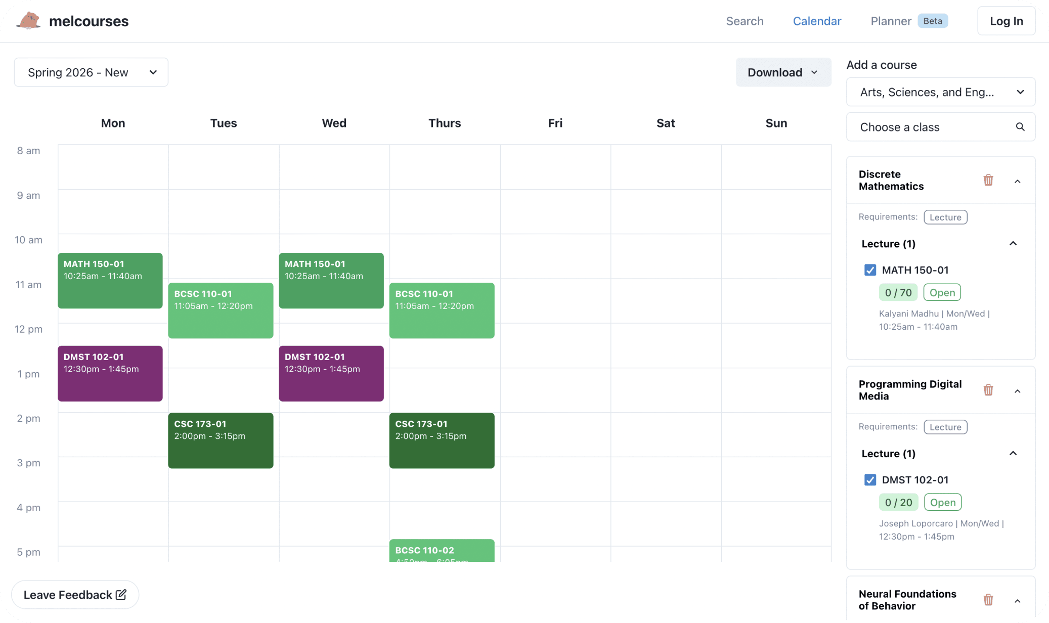 Melcourses scrapes live class data and presents it in a more usable way, letting students search for courses and create schedule plans.
