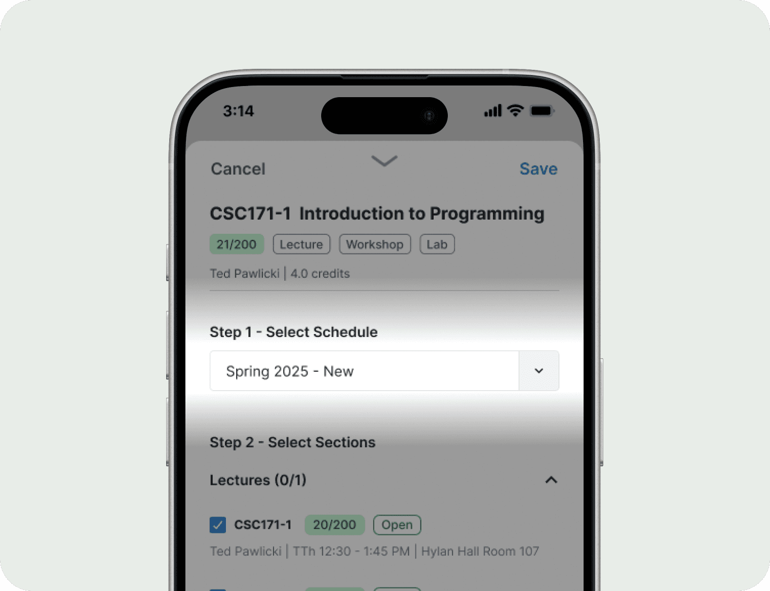 Multi-step modal lets users select schedule and sections
