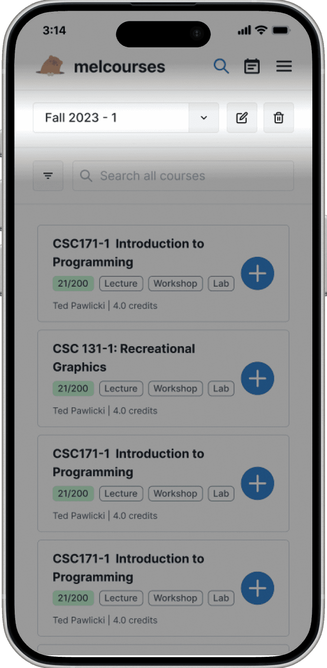 Users aren’t thinking about schedule selection when reading through courses. So I moved the dropdown off the search page into the course adding flow. When the user hits the plus button, the dropdown appears as a step before choosing course sections. This way, users first find a class, then select which schedule they want to place it in.