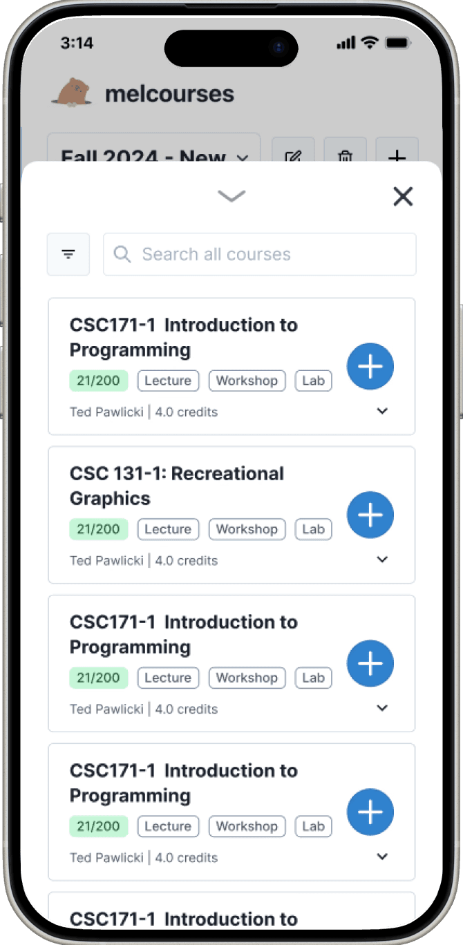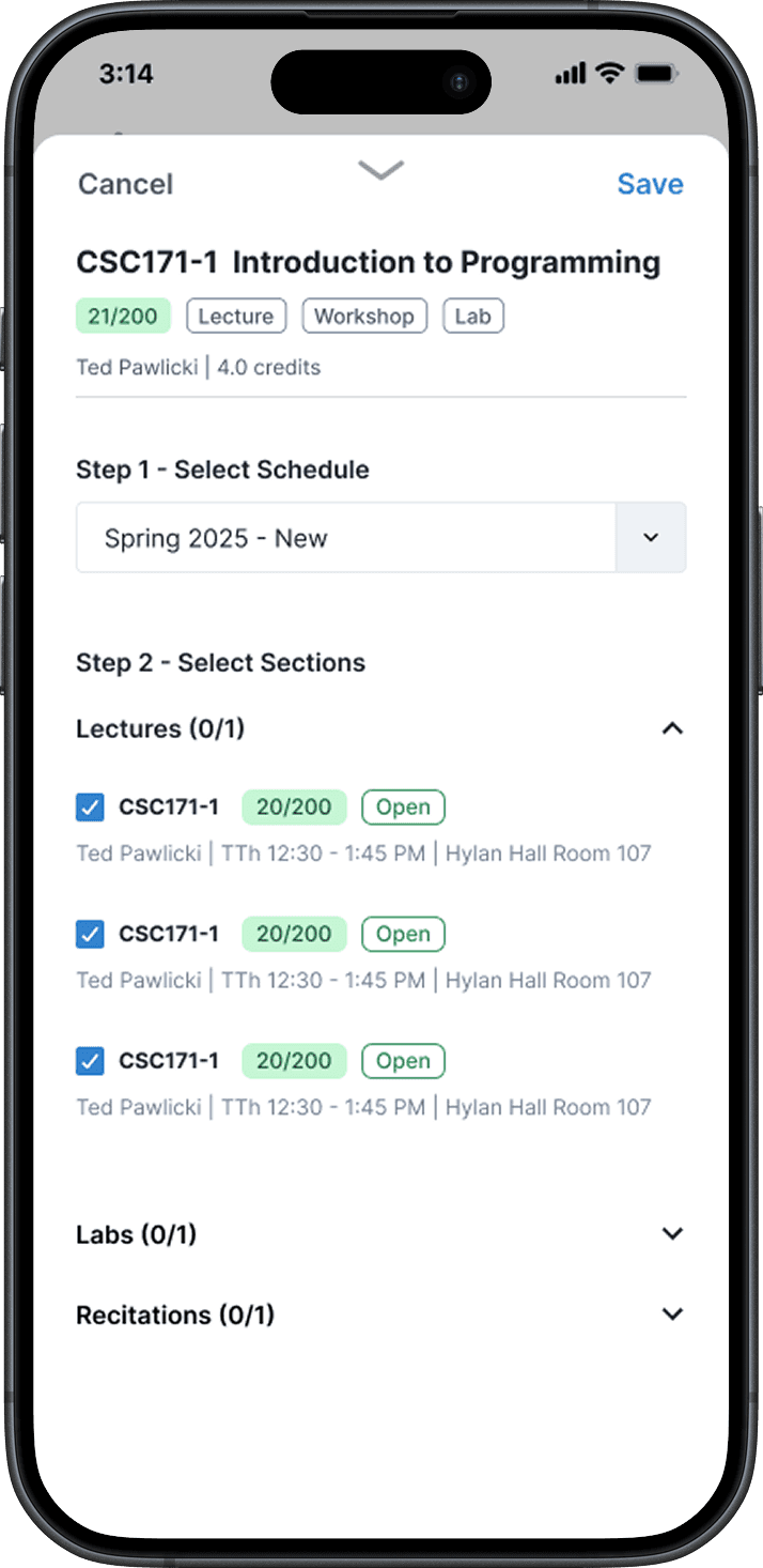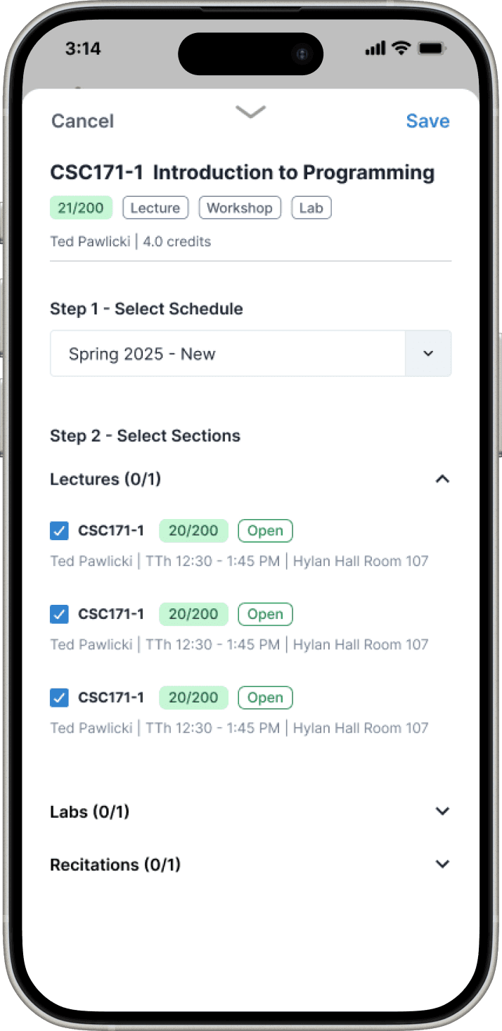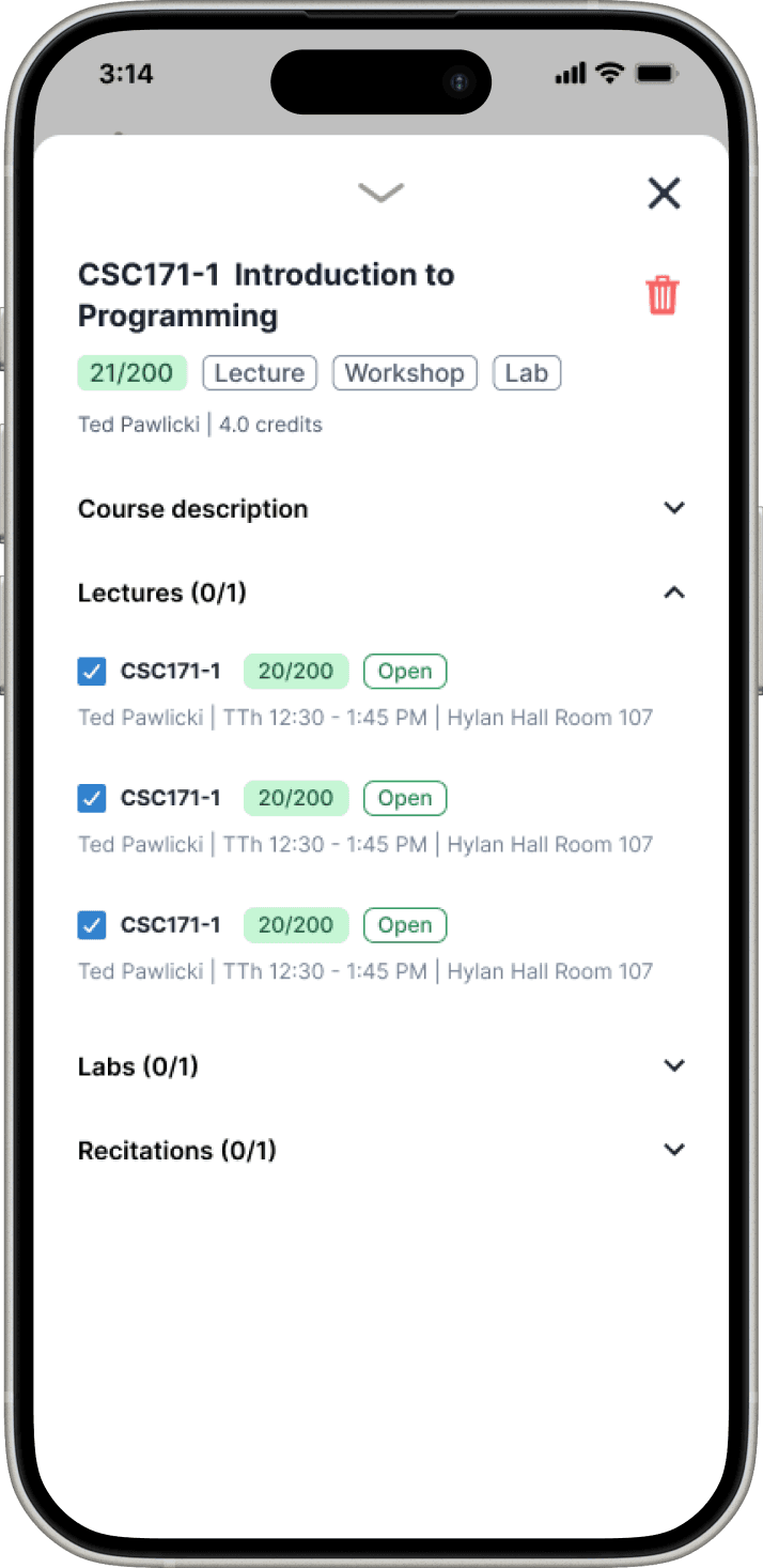 Clicking on a course lets you select section times, using a swipe-able drawer so the visual schedule can be referenced without breaking flow