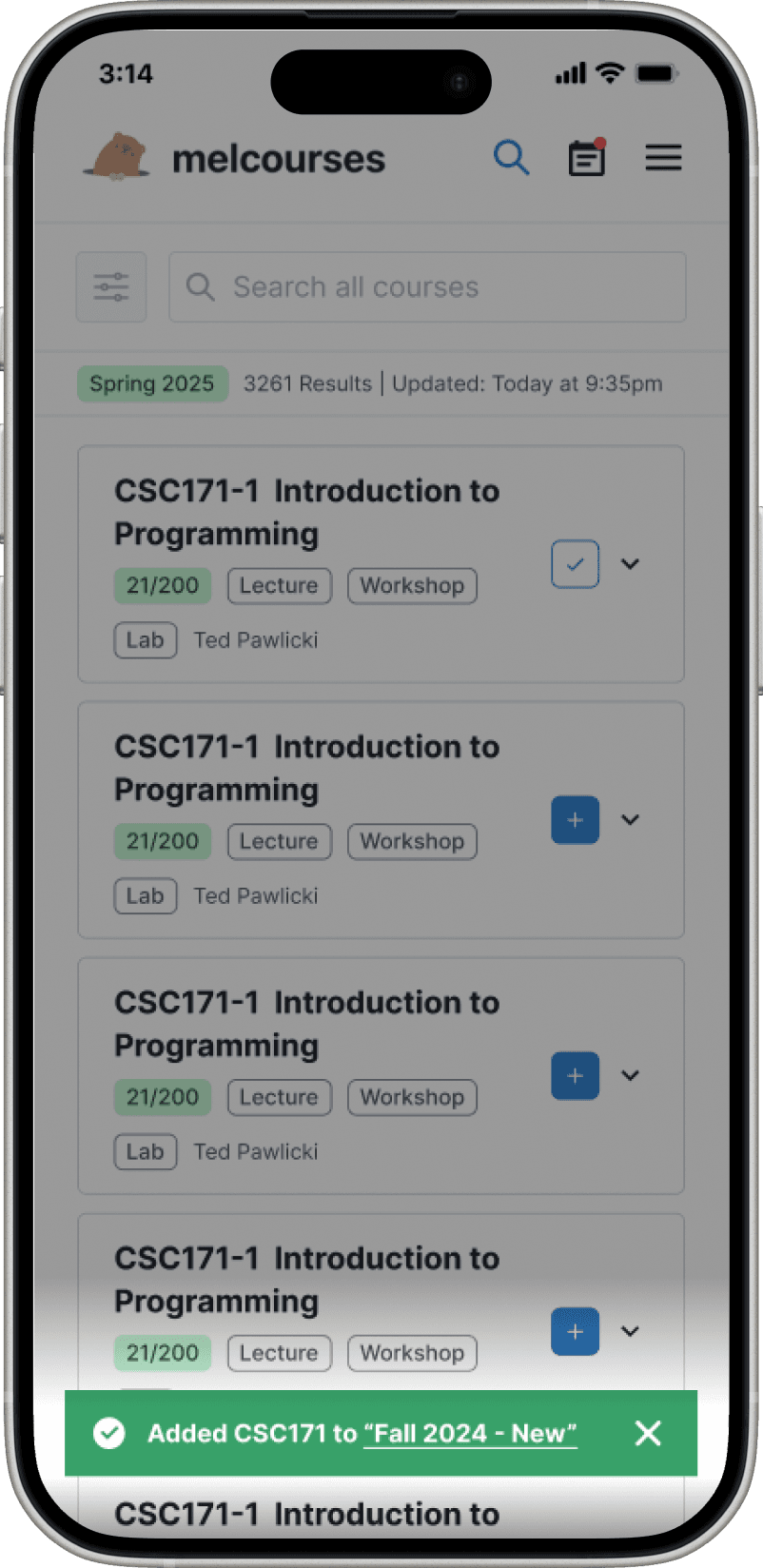 Without a sidebar showing added courses, users had no feedback that a course was successfully added.